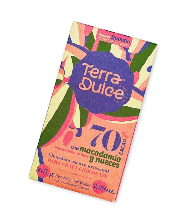- Origen Certificado: Nuestra Barra de Chocolate de 65g al 70% de cacao con Macadamia y Nueces. Proviene del Quindío, garantizando calidad y autenticidad.