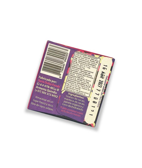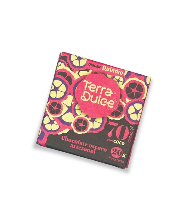 - Origen Certificado: Nuestra barra de chocolate oscuro de 20g al 70% de cacao con Coco proviene del Quindío, asegurando calidad y autenticidad.