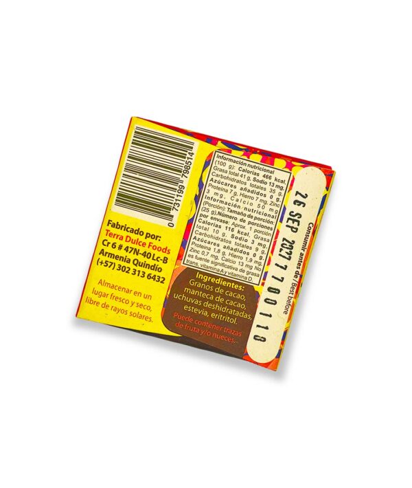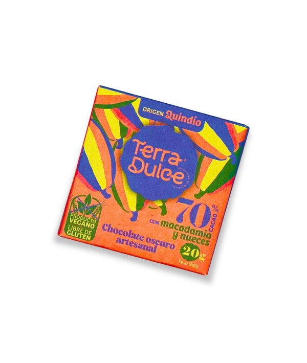 - Origen Certificado: Nuestra barra de chocolate oscuro de 20g con macadamia y nueces, 70% de cacao proviene del Quindío, asegurando calidad y autenticidad.