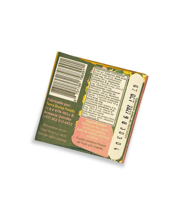 - Origen Certificado: Nuestra barra de chocolate blanco de 20g con Nibs proviene del Quindío, asegurando calidad y autenticidad.