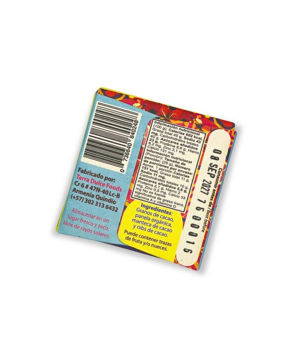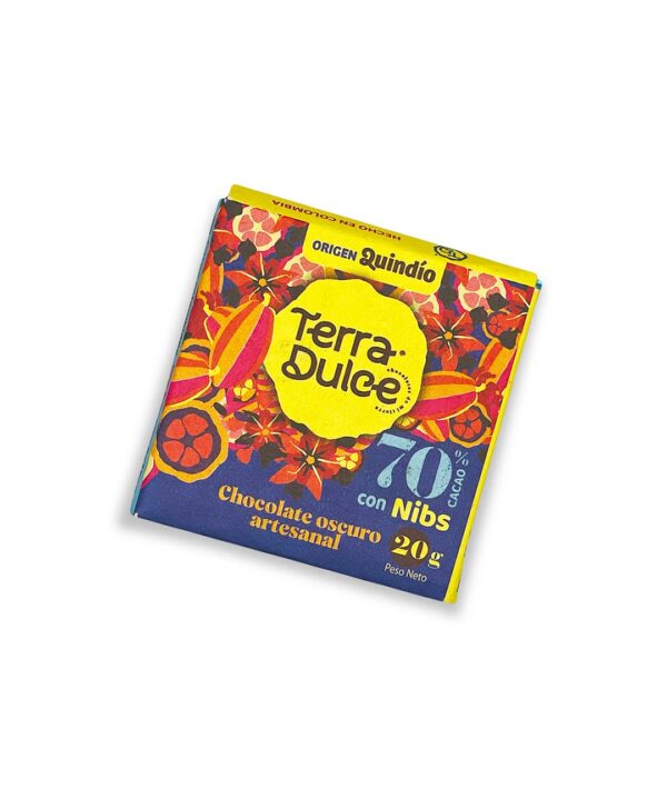 - Origen Certificado: Proveniente del Quindío, nuestra Barra de Chocolate de 20g al 70% de cacao con Nibs, garantiza calidad y autenticidad.