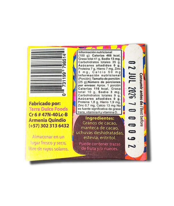 - Origen Certificado: Proveniente del Quindío, nuestra Barra de Chocolate de 20g al 77% de cacao con uchuvas, garantiza calidad y autenticidad