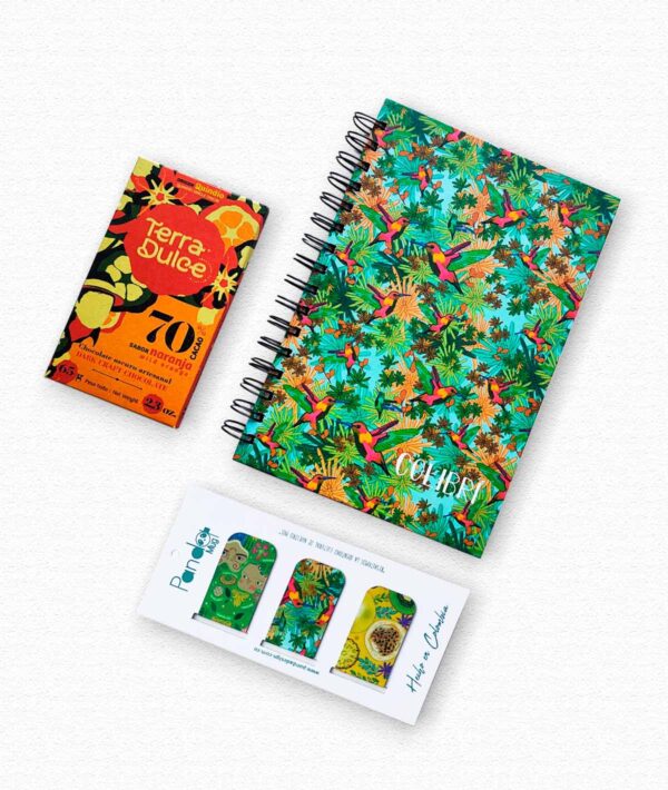 Combo regalo Colibrís: Cuaderno, chocolate amargo, separadores de libros
