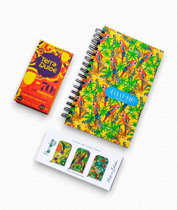 Combo regalo Guacamayas: Cuaderno, chocolate amargo, separadores de libros