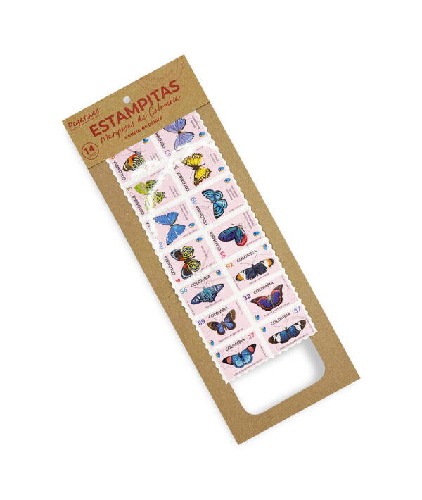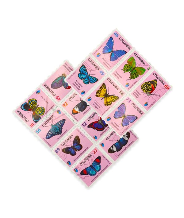 Colección de 14 estampillas ilustradas inspiradas en mariposas colombianas.