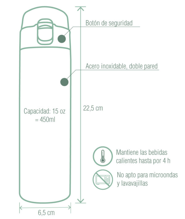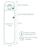 - Hermético, las bebidas se conservan calientes o frías hasta por 4h.